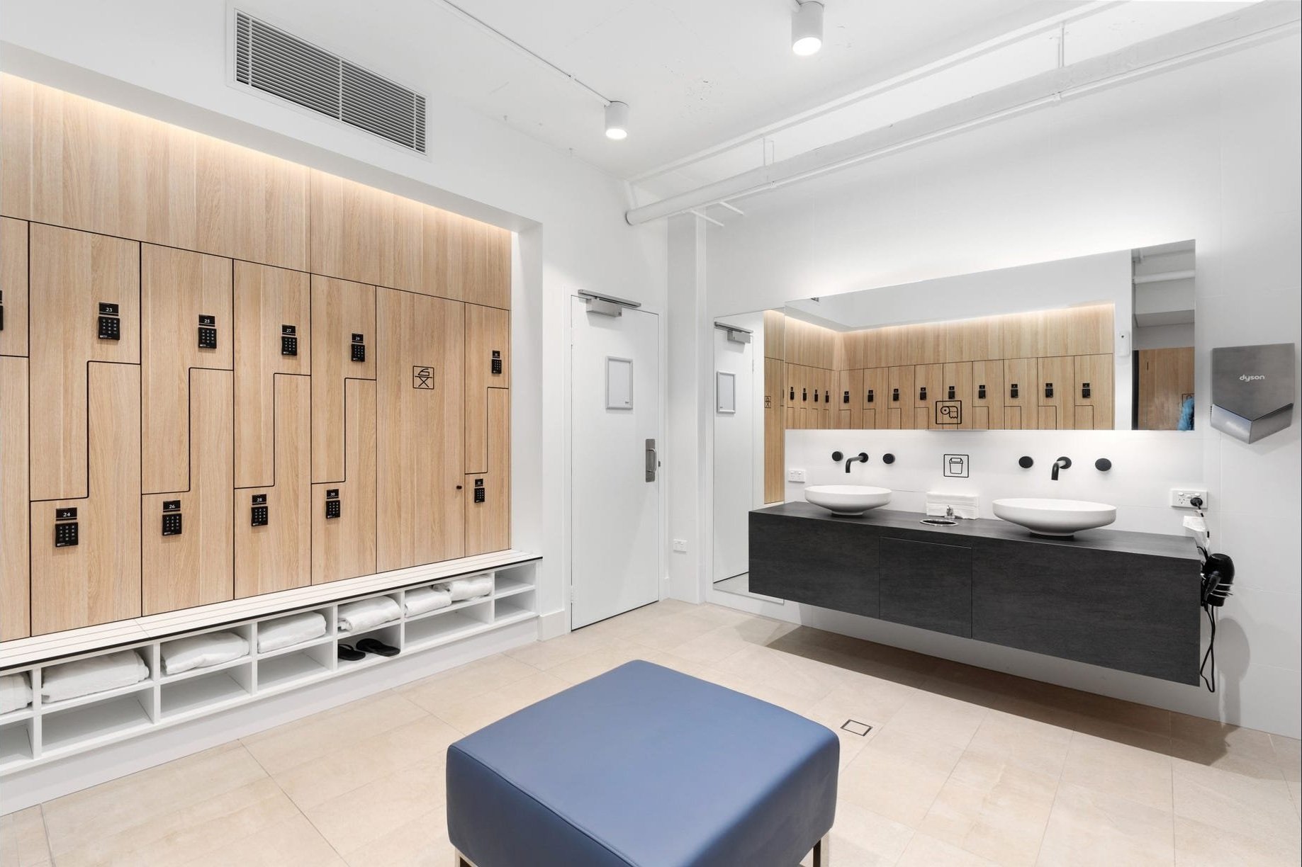 The change room and locker area features a layered lighting design. Recessed LED downlights provide general illumination with minimal shadowing, while integrated LED strip lighting behind the upper lockers adds a warm ambient glow and emphasizes the timber finishes. Above the vanity, backlit mirrors enhance task lighting, creating a crisp, functional space for grooming and personal care.